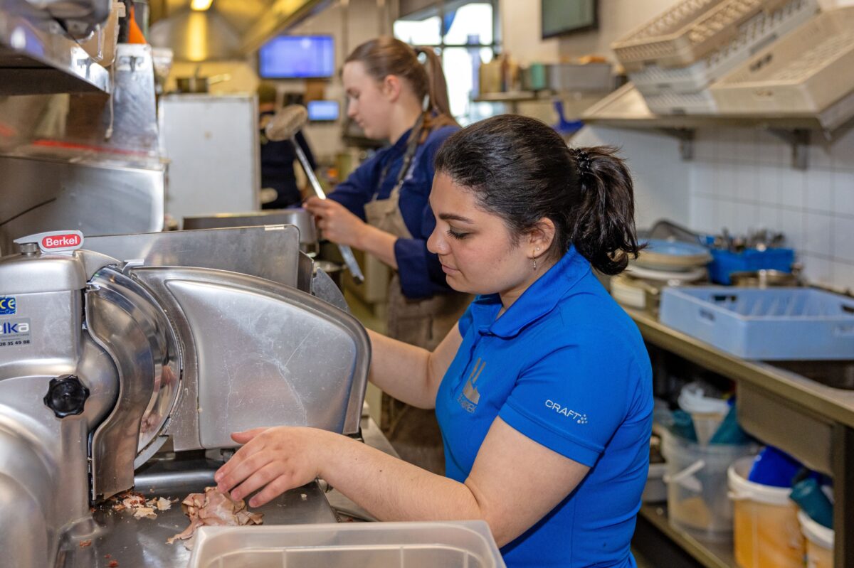 Ook Emma begon met een bijbaantje in de afwas, kwam daarna stage lopen en kreeg uiteindelijk een contract. Ze werkt 18 uur per week als keukenhulp. ‘Voorbereidende werkzaamheden, sausjes in potjes doen, afwassen, desserts helpen maken. Ze heeft een vast ritme en dat is fijn voor haar,’ vertelt Moes. ‘Emma is wat gevoeliger voor veranderingen en heeft wat meer begeleiding nodig, maar ze voelt zelf goed aan wanneer ze even rust moet nemen. Dat respecteren we.’