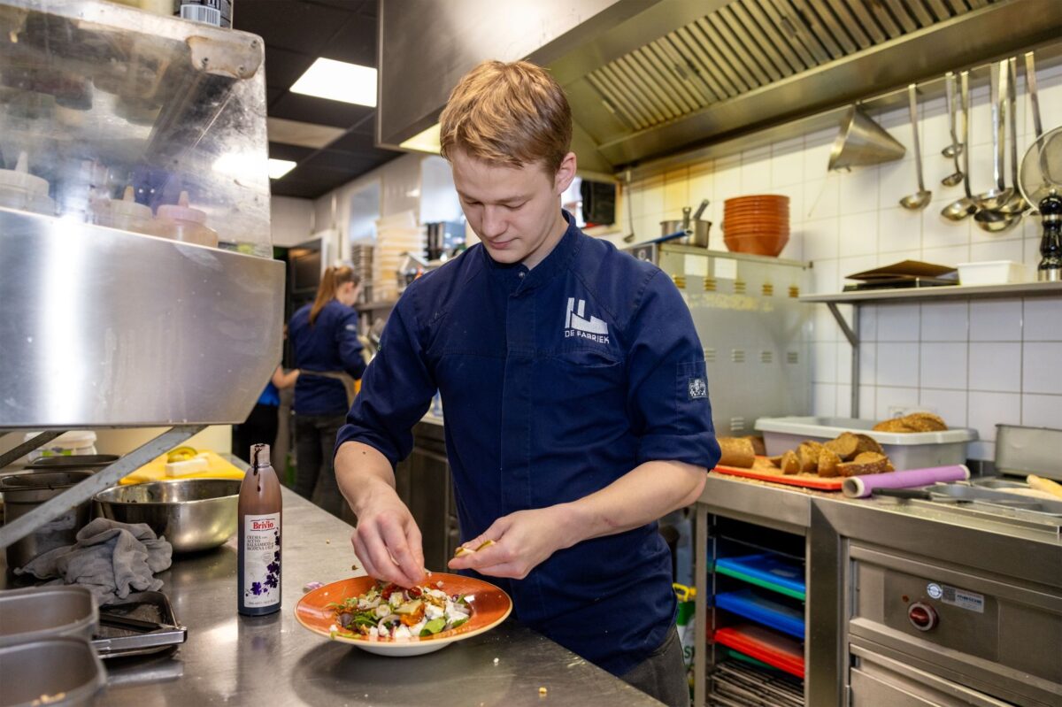Na zijn middelbare schoolperiode volgde Rein een mbo-opleiding tot kok in BBL-vorm. Geen gemakkelijke weg, maar met begeleiding vanuit school én De Fabriek haalde hij zijn diploma. ‘Hij voelt zich kok en dat is hij ook,’ zegt Moes trots. Rein werkt inmiddels 32 uur per week en draait volledig mee in de keuken. ‘Hij is loyaal, nooit ziek, bijna altijd op tijd. Je kunt echt op hem bouwen.’ Rein heeft het ontzettend naar zijn zin in de keuken. ‘Het allerleukste aan mijn werk vind ik het georganiseerd werken tijdens het diner. En dan af en toe het magazijn helemaal opruimen om tot rust te komen, echt een fijne combi.’